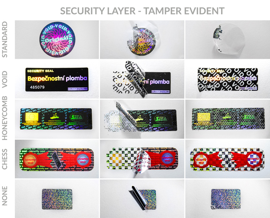 | Security (tamper evident) layer | Standard destruction - peel-off destruction, VOID - VOID pattern remains on the surface upon destruction, Squares - chequerboard pattern remains on the surface upon destruction, Honeycomb - a honeycomb pattern remains on the surface upon destruction, No security - integral sticker peels off |